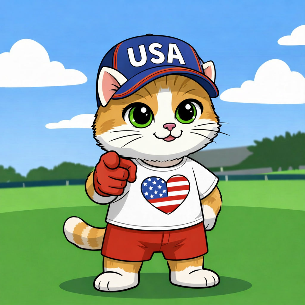 This is a cute cartoon cat with big green eyes wearing a βUSAβ cap, pointing directly at the viewer, creating the effect of a personal address He is wearing a T-shirt with a heart in the colors of the American flag and red shorts β the image is immediately interpreted as patriotic.